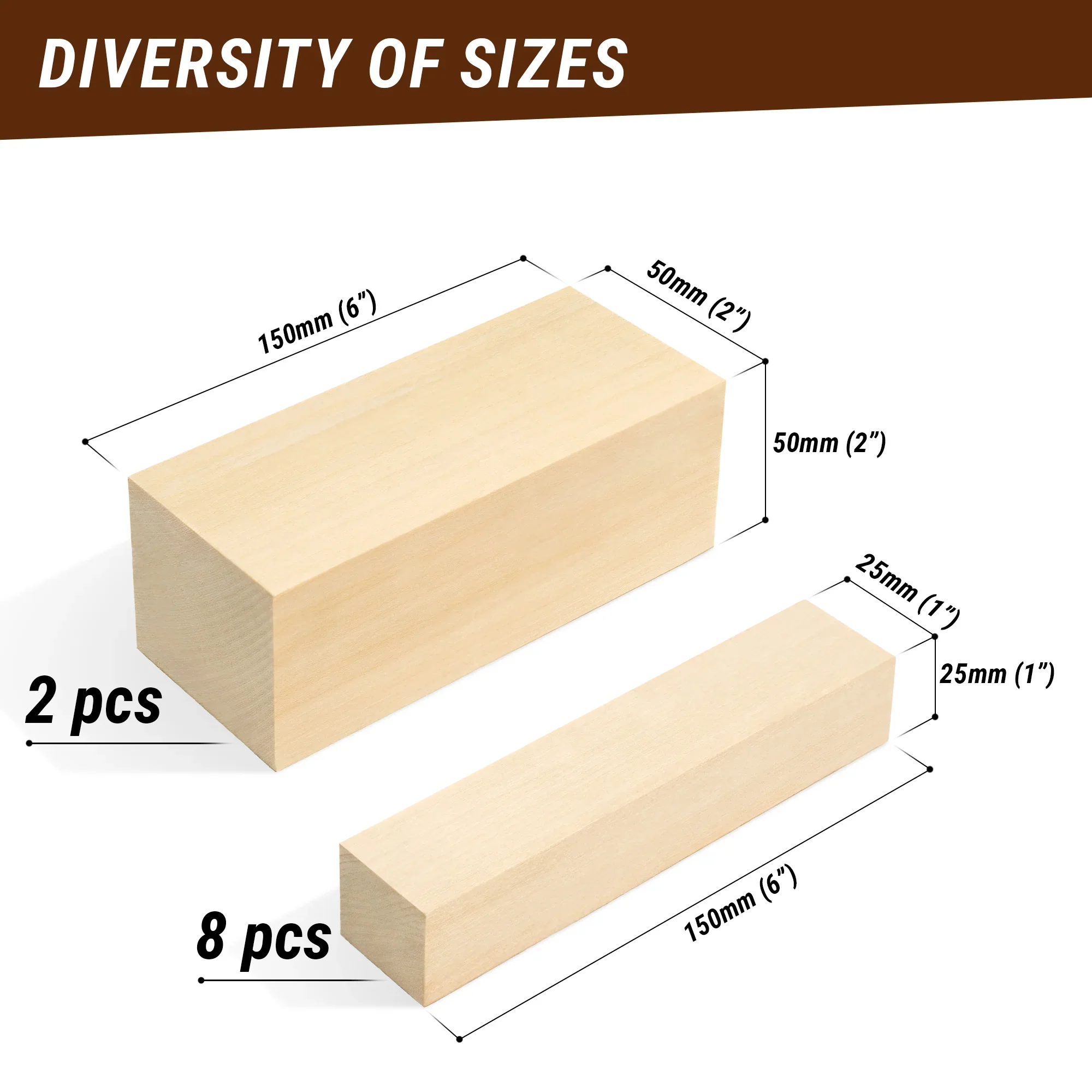 Ez az átfogó készlet tíz különböző méretű fahasábot tartalmaz, amelyek minden képzettségi szintű faragók számára alkalmasak. Két nagyobb, 5 cm x 5 cm x 15 cm-es téglalappal és nyolc 2,5 cm x 2,5 cm x 15 cm-es faragó kockával ez a sokoldalú választék tökéletes vásznat biztosít művészi elképzeléseihez.