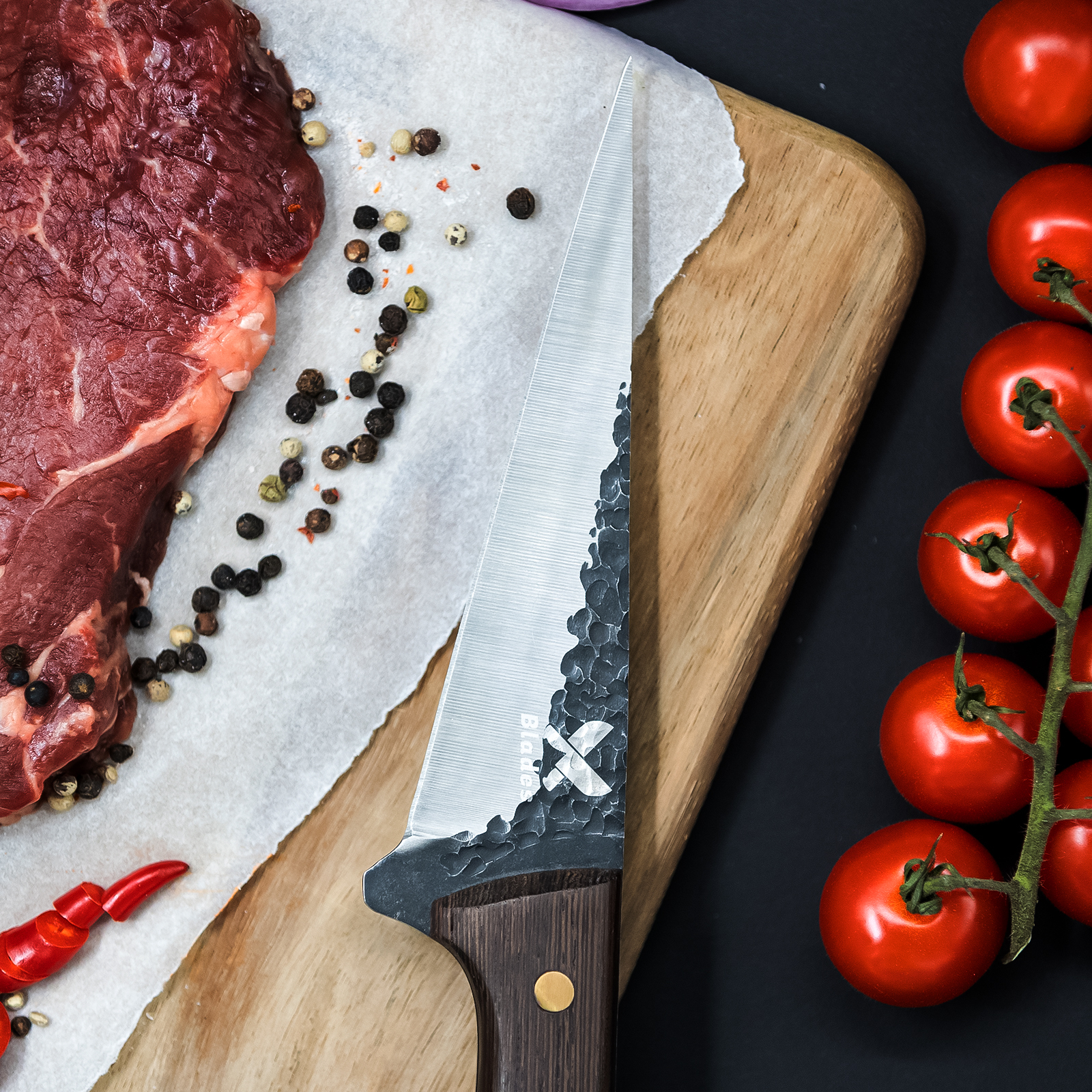 4.Ne vágjon nagy csontokat, ne üsse meg a nagy csontokat. Hentesmunkához, nagy, kemény csontok vágásához speciális fűrészekre van szükség, általában nagyon kemény acélból, például Carbon Steelből, széles szögű, durva, vastag pengével, amely súlyát tekintve kiegyensúlyozott, hogy le lehessen vele ütni. A Blades.ro még nem forgalmaz ilyen fűrészeket.